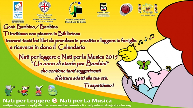A partire da Lunedì 2 Marzo, è iniziata la distribuzione delle nuove guide bibliografiche – calendario Nati Per Leggere – Nati Per la Musica 2015, presso le Biblioteche aderenti al Sistema Bibliotecario Interurbano del Sulcis, che presto verrà operata anche presso gli ambulatori pediatrici, i consultori e altre strutture sanitarie del territorio.