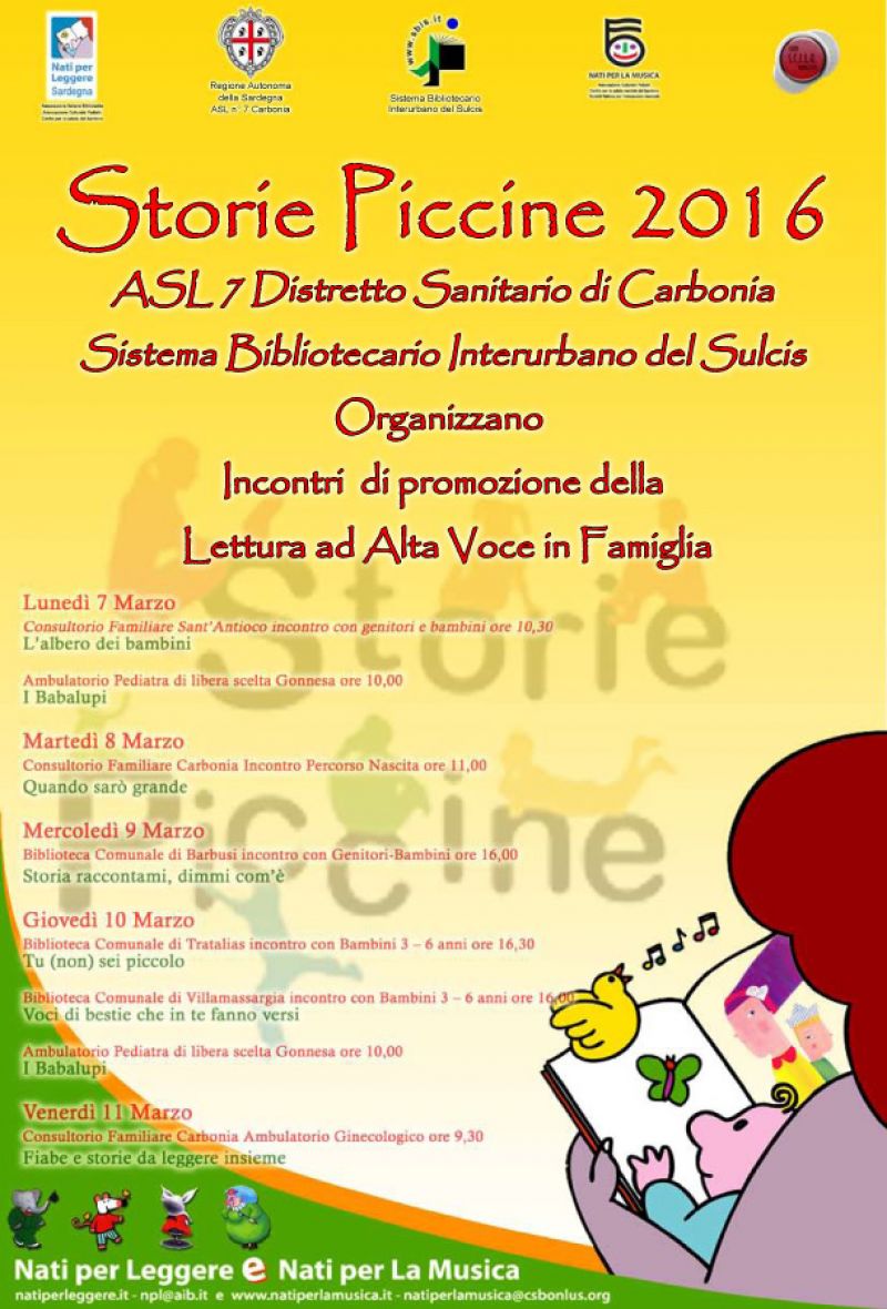 L’evento rientra nelle attività di promozione del Progetto “Nati per Leggere”, realizzato dal Sistema Bibliotecario Interurbano del Sulcis, di cui il Comune di Carbonia è ente capofila, in collaborazione con la ASL 7 - Distretto Sanitario di Carbonia.
