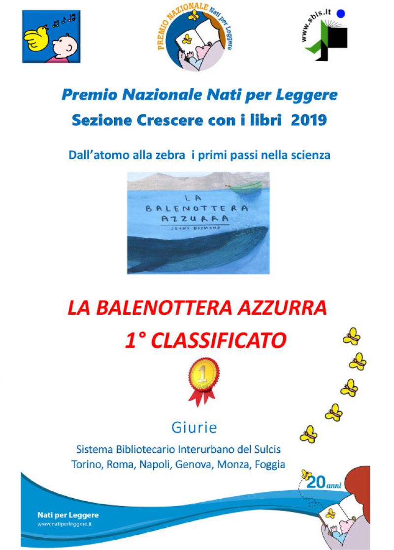 il Libro vincitore del Premio Nazionale Nati per Leggere, sezione Crescere con i Libri 2019 è "La Balenottera Azzurra" di Jenni Desmond, il libro ha ricevuto il maggior numero di voti anche da parte delle Giurie SBIS. Il nostro Sistema, ha collaborato con Torino, Roma ,Genova, Monza , Napoli per la scelta dei libri candidati e poi presentando in varie sedi i testi in concorso. Il lavoro si è concluso con la raccolta dei voti di preferenza espressi da bambini e adulti e l’invio al coordinamento della Segreteria Nazionale del premio, che ha decretato il vincitore.