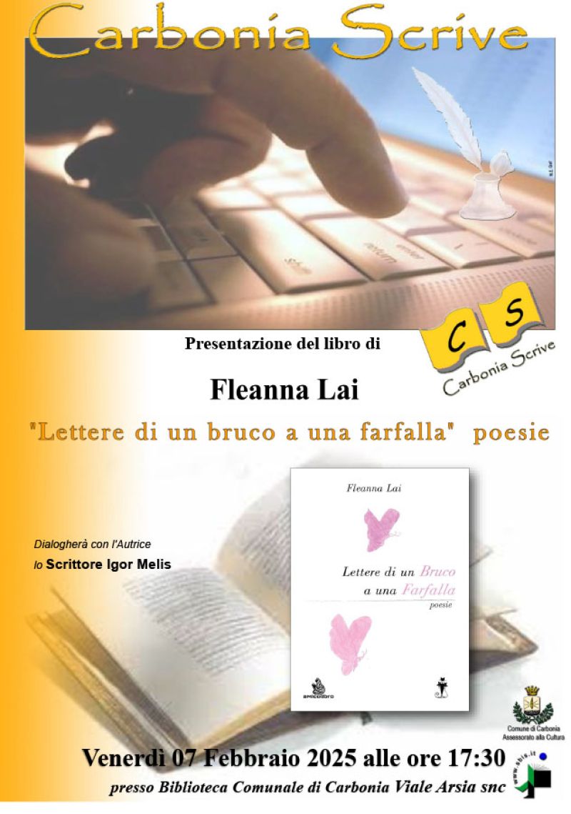 Venerdì 7 Febbraio alle ore 17:30 presso la Biblioteca Comunale di Carbonia, sita in viale Arsia s.n.c., nell'ambito della rassegna Carbonia Scrive, si terrà la presentazione del Libro di Fleanna Lai "Lettere di un bruco a una farfalla" poesie.