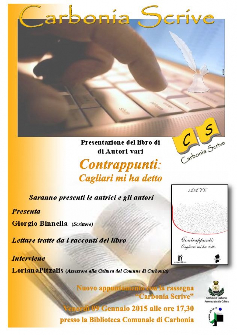 L'iniziativa, voluta dall'Assessorato alla Cultura del Comune di Carbonia, in collaborazione con lo SBIS (Sistema Bibliotecario Interurbano del Sulcis), rientra nel più ampio progetto "Carbonia Scrive". Interverranno alla presentazione lo scrittore Giorgio Binnella e l'Assessore alla Cultura del Comune di Carbonia Loriana Pitzalis.