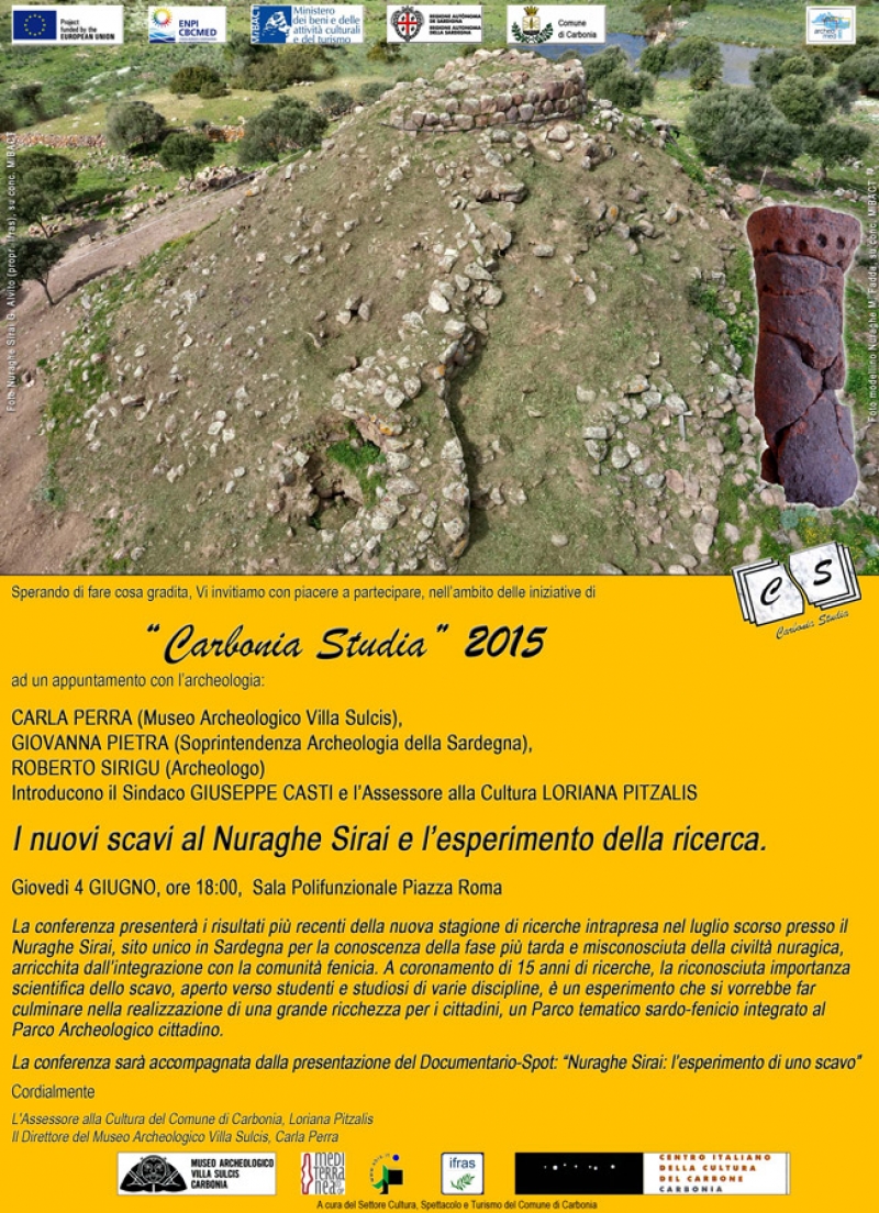 Giovedì 4 Giugno 2015, alle ore 18, presso la sala Polifunzionale di Piazza Roma, si terrà un nuovo appuntamento con la rassegna “Carbonia studia” 2015. Il titolo della prossima conferenza della Rassegna, organizzata dal Comune di Carbonia, è “I nuovi scavi al Nuraghe Sirai e l’esperimento della ricerca”.