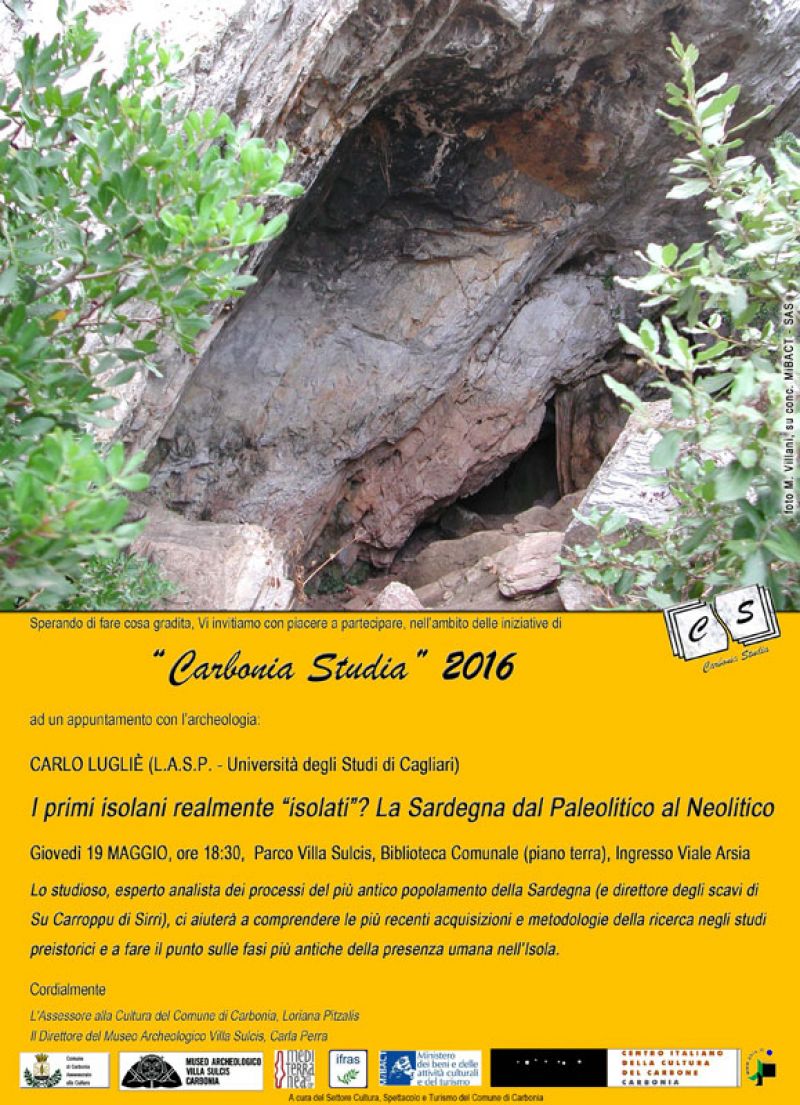 Giovedì 19 maggio, alle ore 18.30, presso la Biblioteca comunale di viale Arsia (Parco Villa Sulcis), si terrà un appuntamento con la storia dell'archeologia dal titolo "I primi Isolani realmente isolati? La Sardegna dal Paleolitico al Neolitico". La conferenza sarà tenuta da Carlo Lugliè, direttore degli scavi di "Su Carroppu" a Sirri.