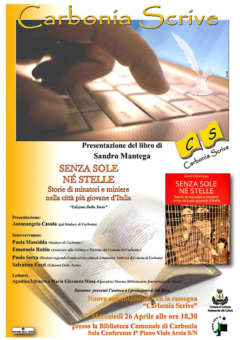 Nuovo appuntamento con la Rassegna "Carbonia Scrive": mercoledì 26 aprile, alle ore 18.30, presso la Biblioteca Comunale di Carbonia, in viale Arsia, sarà presentato il libro "Senza sole né stelle - Storie di minatori e miniere nella città più giovane d'Italia" del giornalista Sandro Mantega.