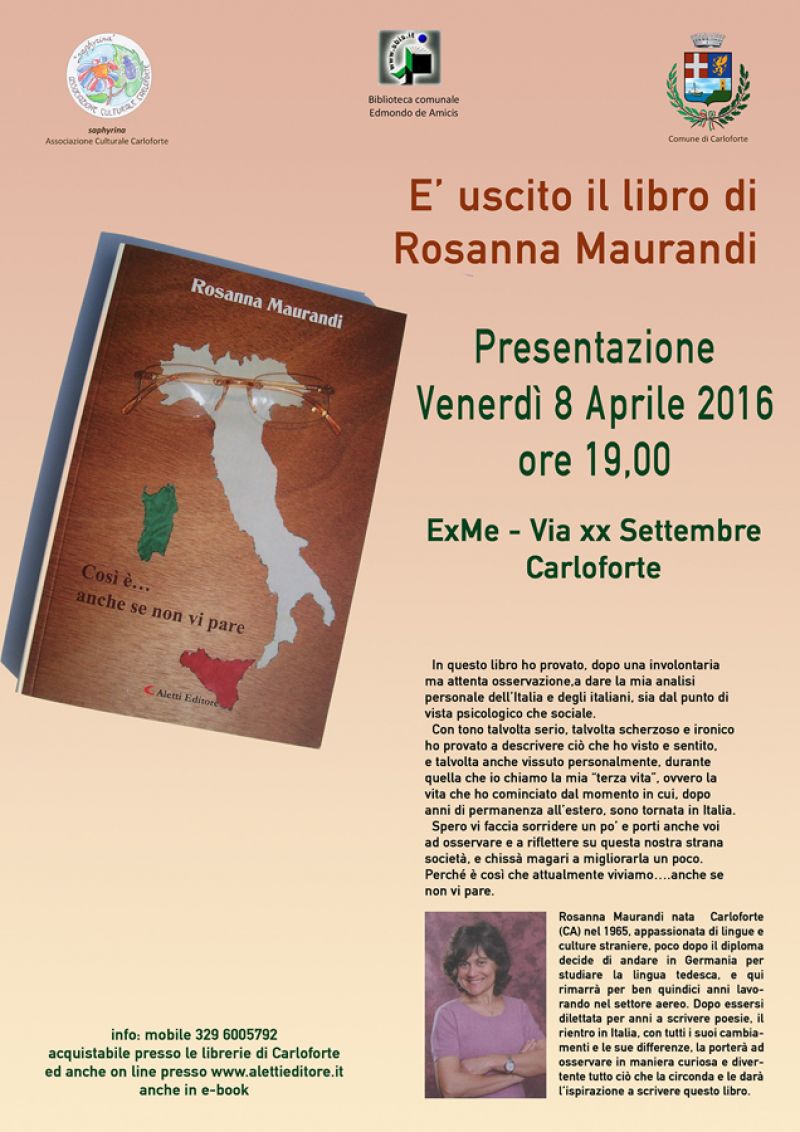 Venerdì 8 aprile 2016, alle ore 19.00, verrà presentato presso la biblioteca comunale di Carloforte il libro "Così è.. anche se non vi pare", in cui l'autrice Rosanna Maurandi fa un'analisi personale dell'Italia e degli italiani. Un libro ironico, pungente e molto reale su cui riflettere.
